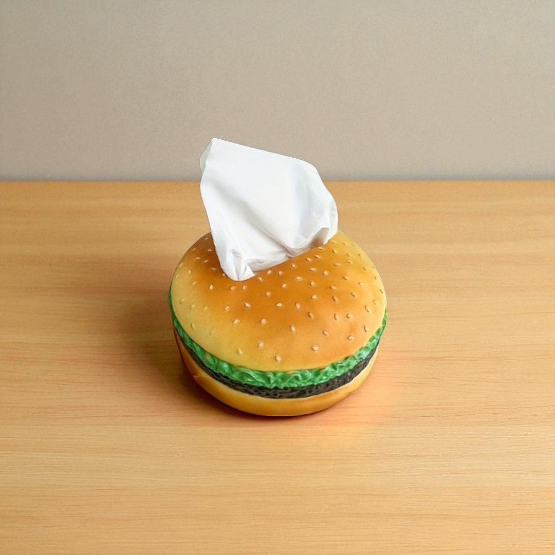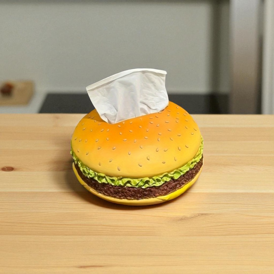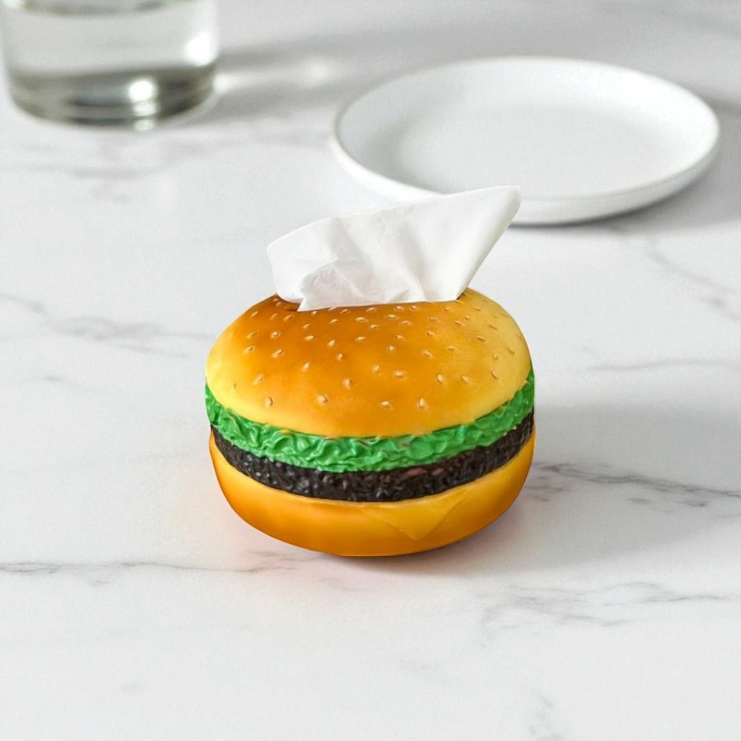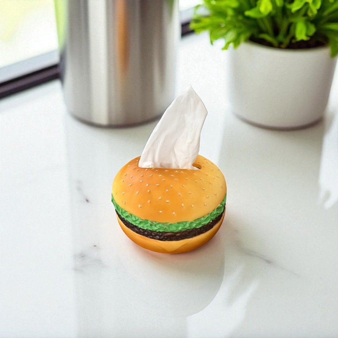 Add a delicious twist to your space with our Burger Tissue Dispenser – the perfect blend of functionality and fun! Designed to look like a realistic hamburger, this eye-catching tissue box cover brings instant charm to your kitchen, dining table, office desk, or car. Crafted from high-quality, durable materials, it holds standard-sized tissue packs and dispenses them through the top bun, making clean-ups a lot more entertaining!