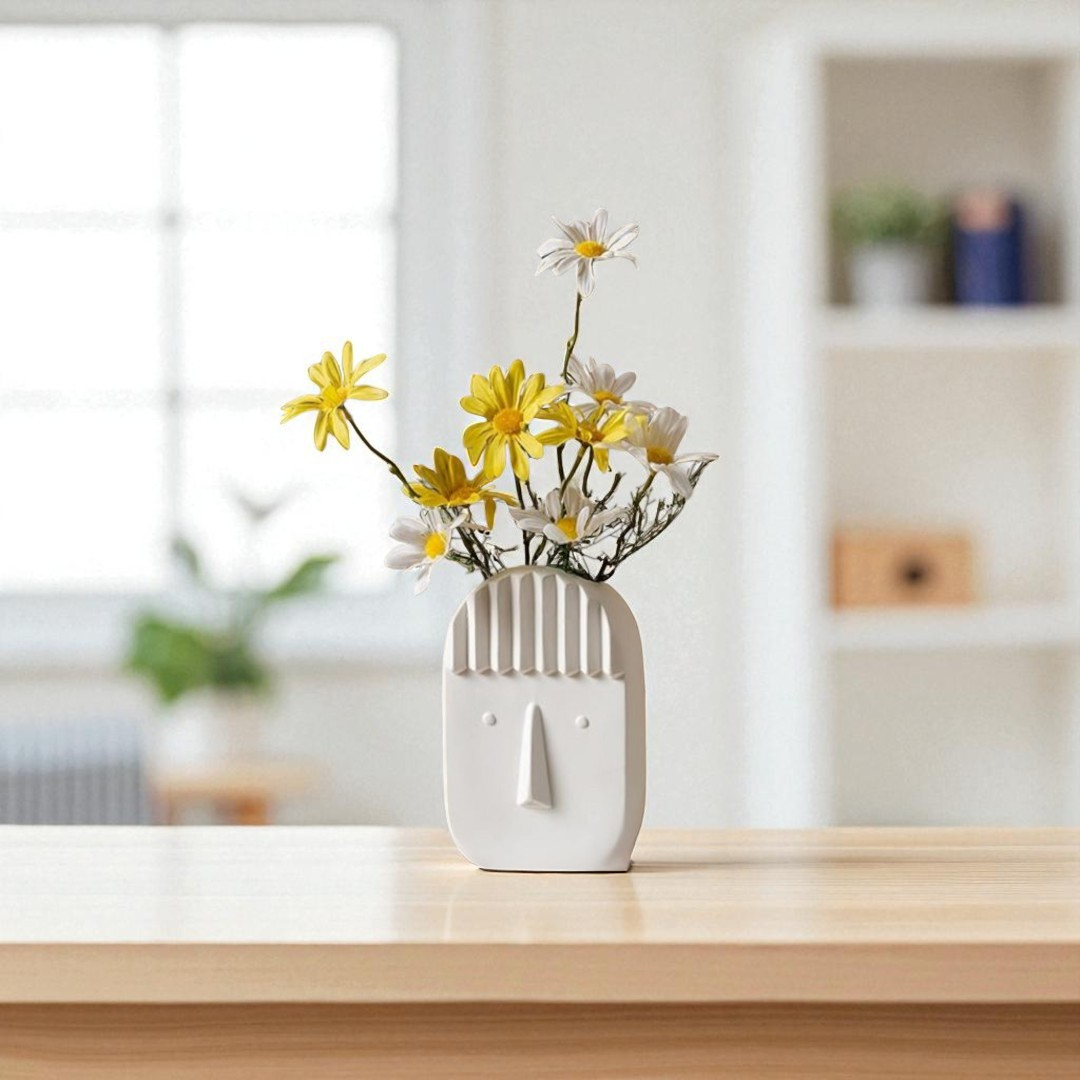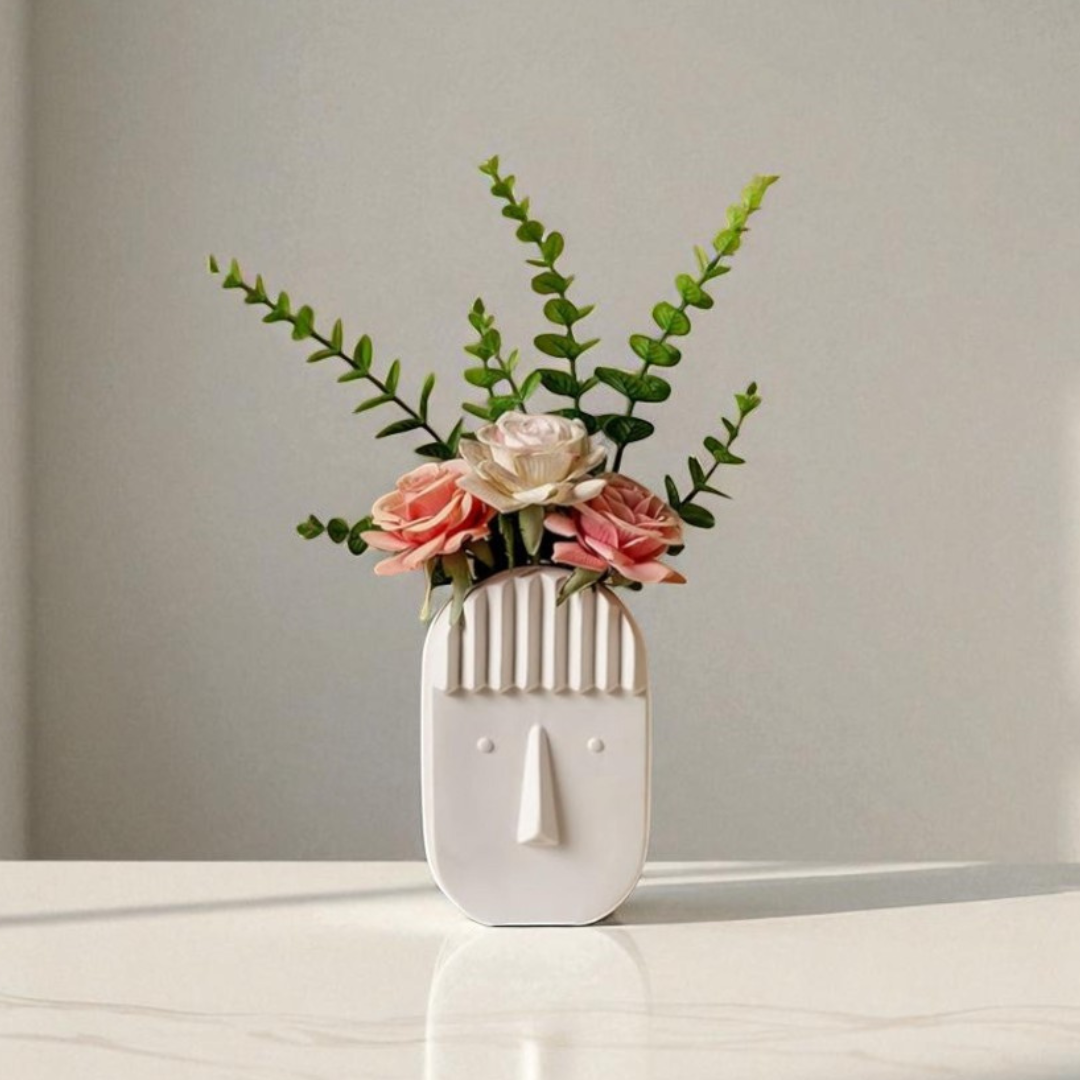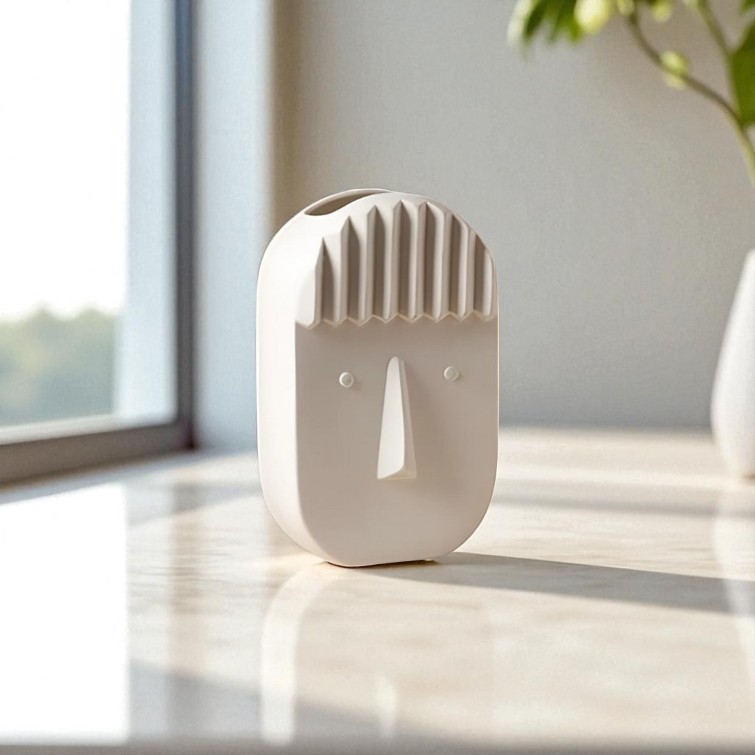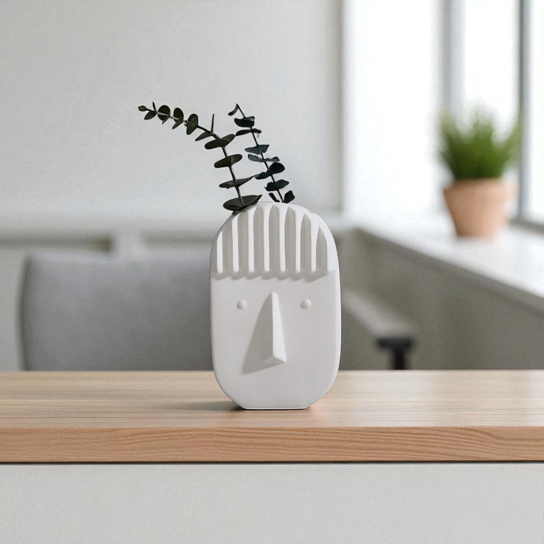 Add a touch of modern artistry to your space with this minimalist ceramic face vase. Featuring a sleek sculptural design with subtle facial features and textured hair detailing, this vase brings personality and style to any room. Perfect for holding flowers, dried botanicals, or as a decorative accent on its own.