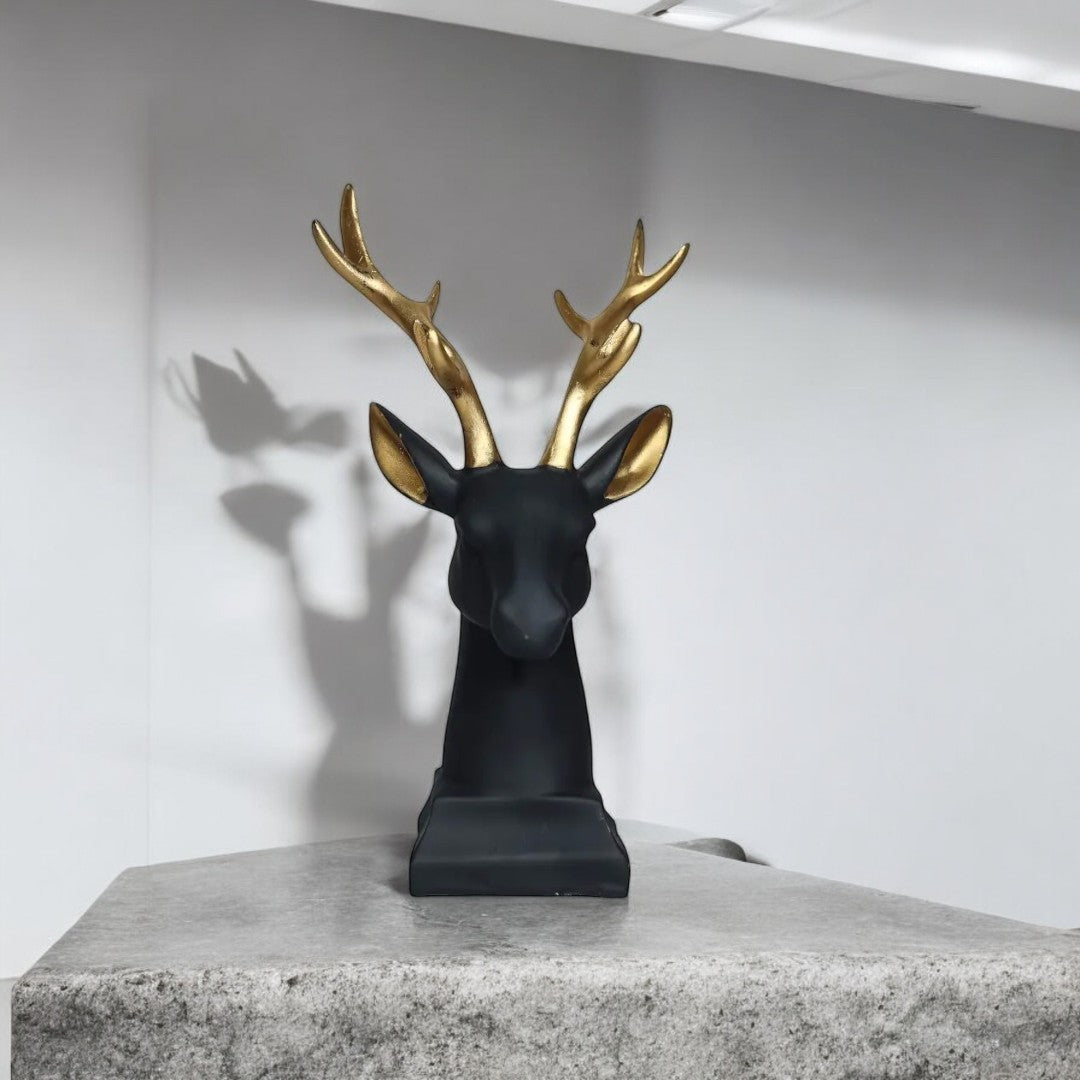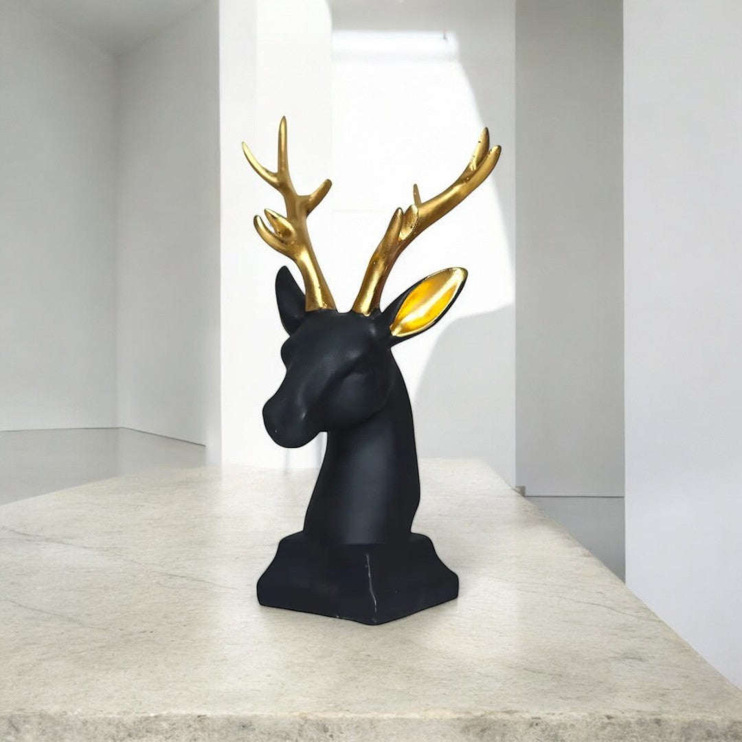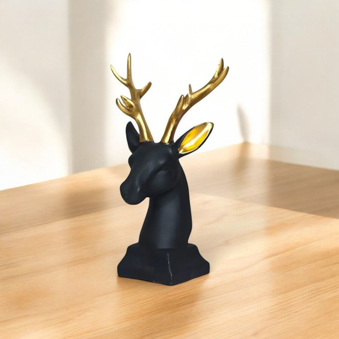 Enhance your space with this Elegant Black & Gold Deer Head Showpiece. Crafted from premium resin, its sleek matte black finish and striking gold antlers create a luxurious appeal. Perfect for living rooms, offices, and gifting, this artistic sculpture blends seamlessly with modern interiors.