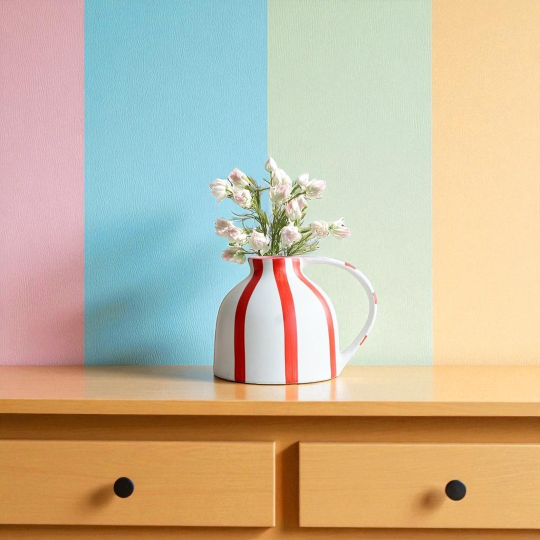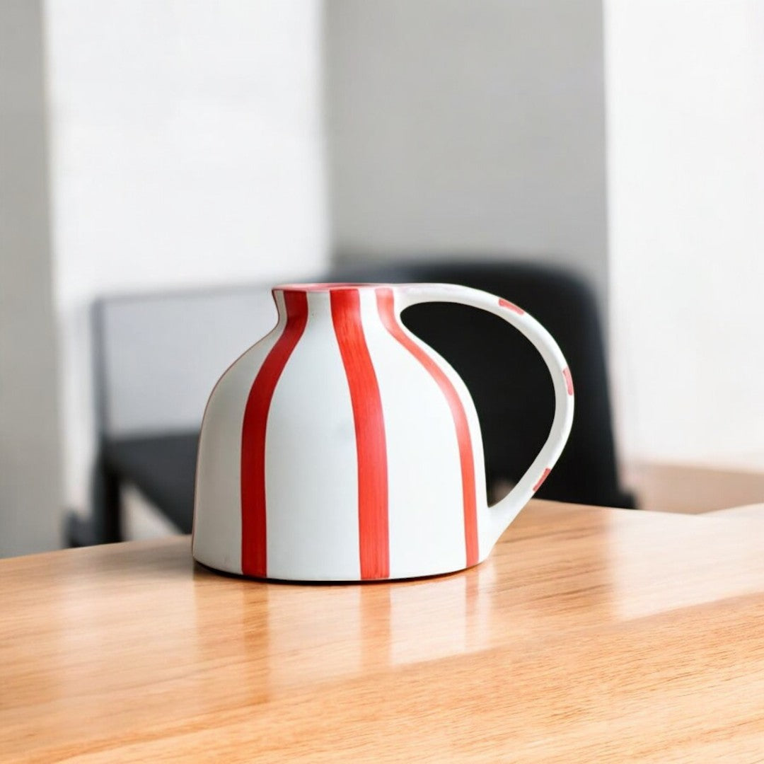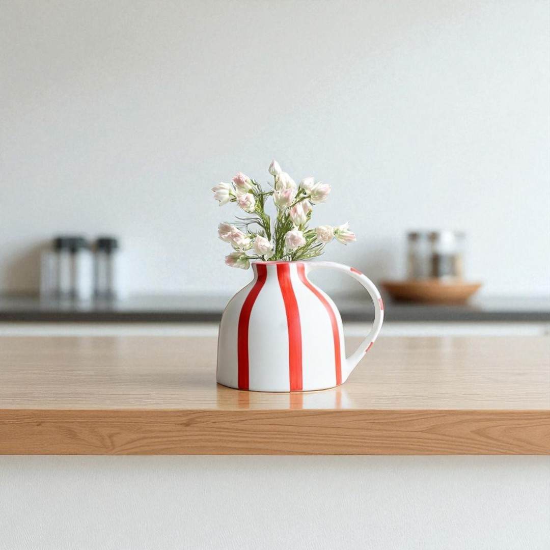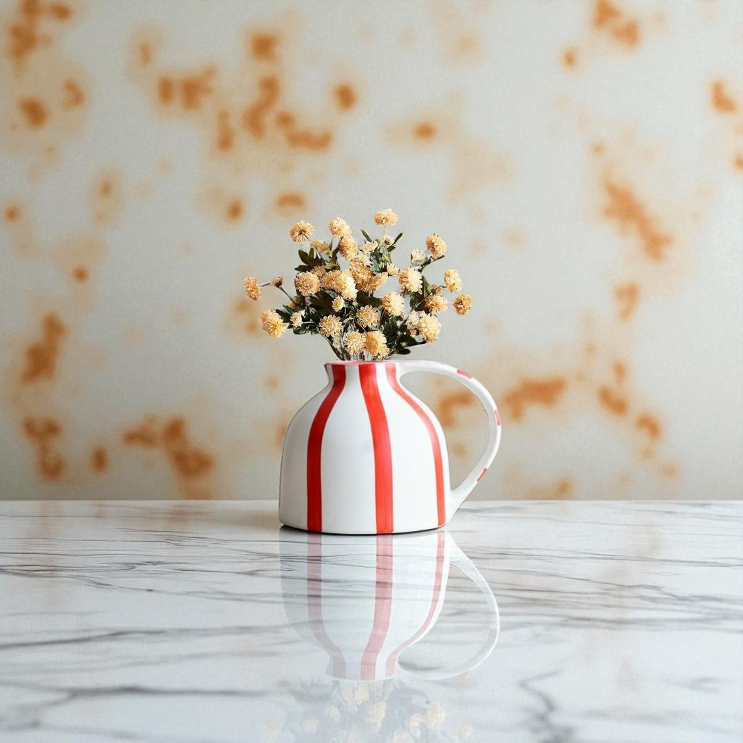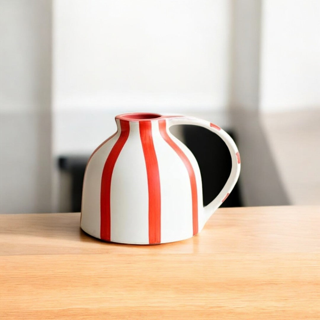 This Handcrafted Ceramic Pitcher Vase is a blend of elegance and functionality. Featuring a vibrant red and white striped design, this piece is perfect for adding a rustic charm to your home. Use it as a decorative vase, a water pitcher, or a stylish tabletop accent. Crafted with precision, it’s a must-have for those who appreciate unique and artistic home decor.