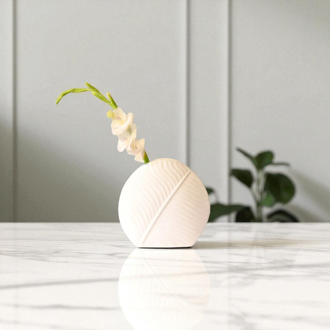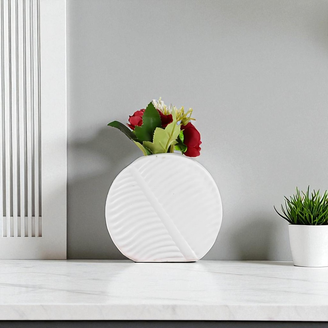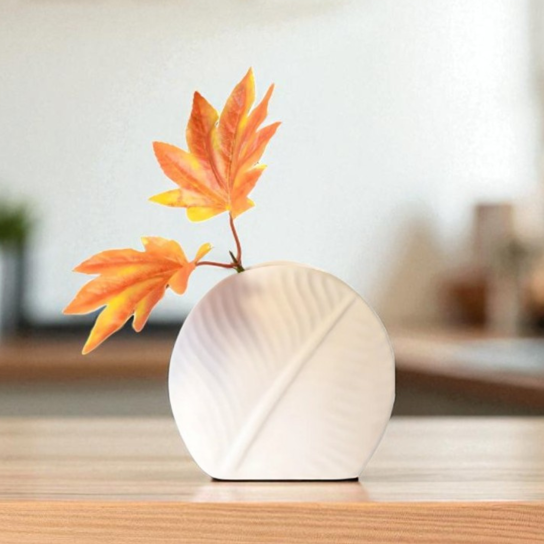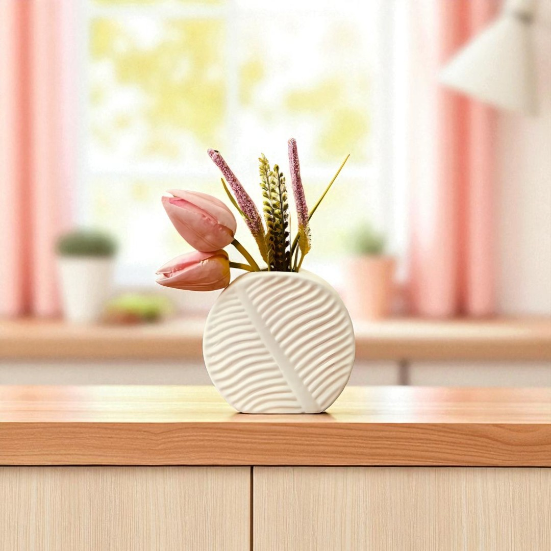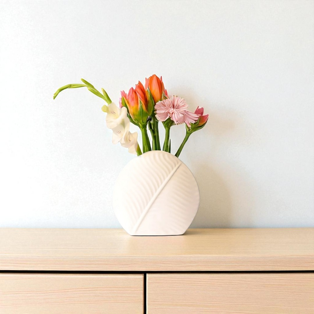 Elevate your décor with this elegantly sculpted round ceramic vase featuring a subtle leaf-embossed pattern. Its minimalist silhouette and soft matte finish bring calm sophistication to any surface, whether displayed solo or holding a single stem.