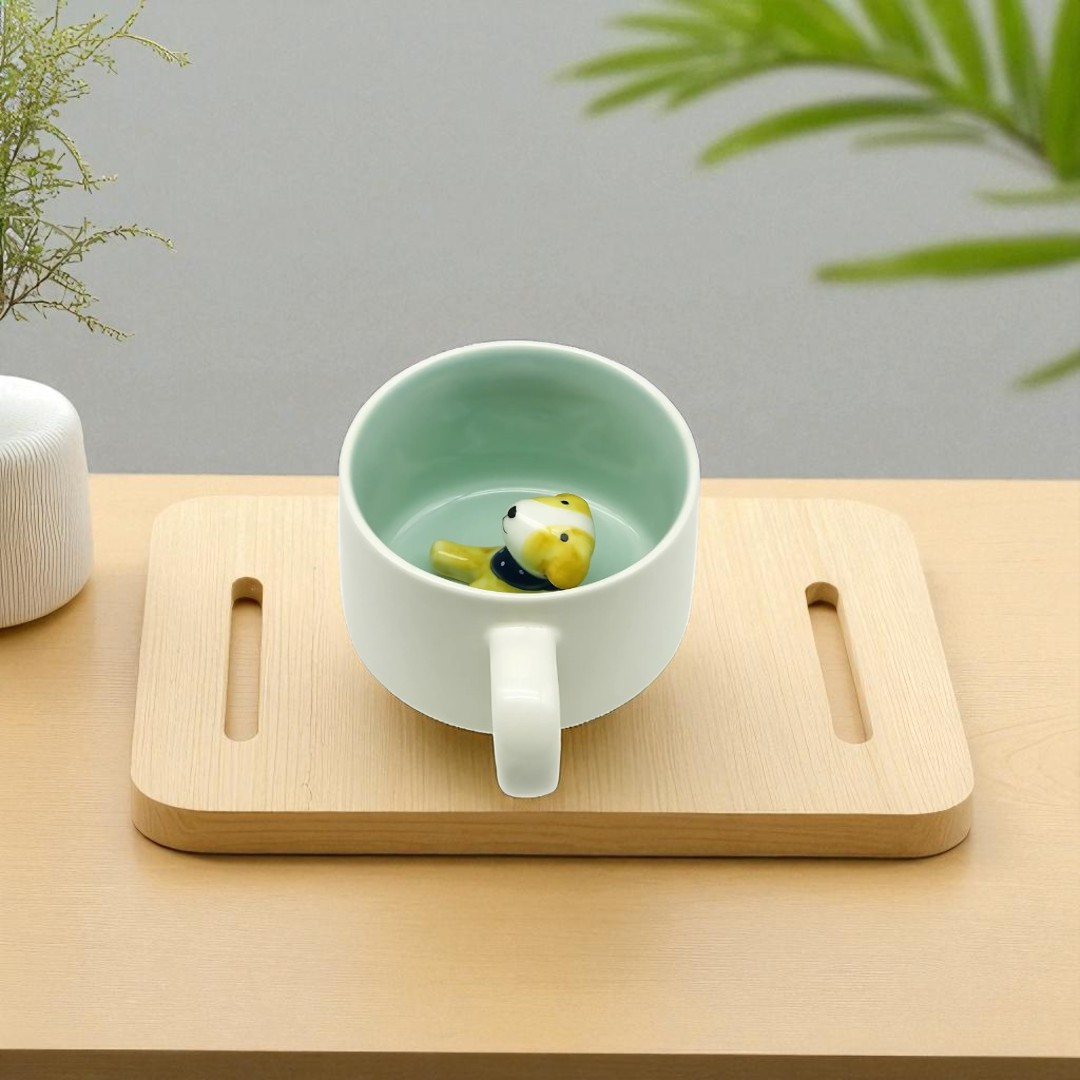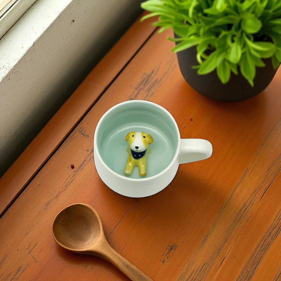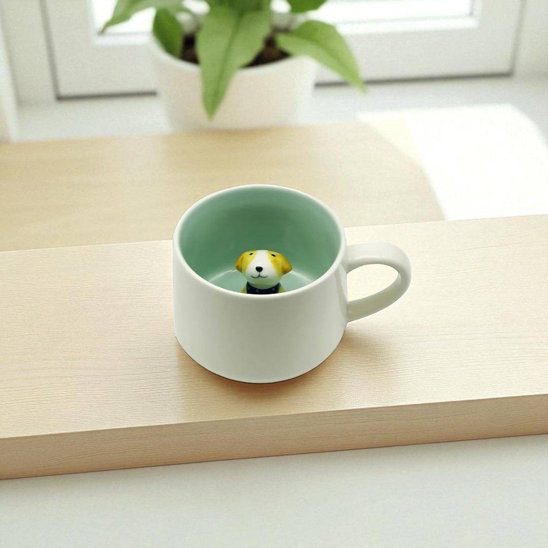 - Hidden ceramic dog figurine inside the mug