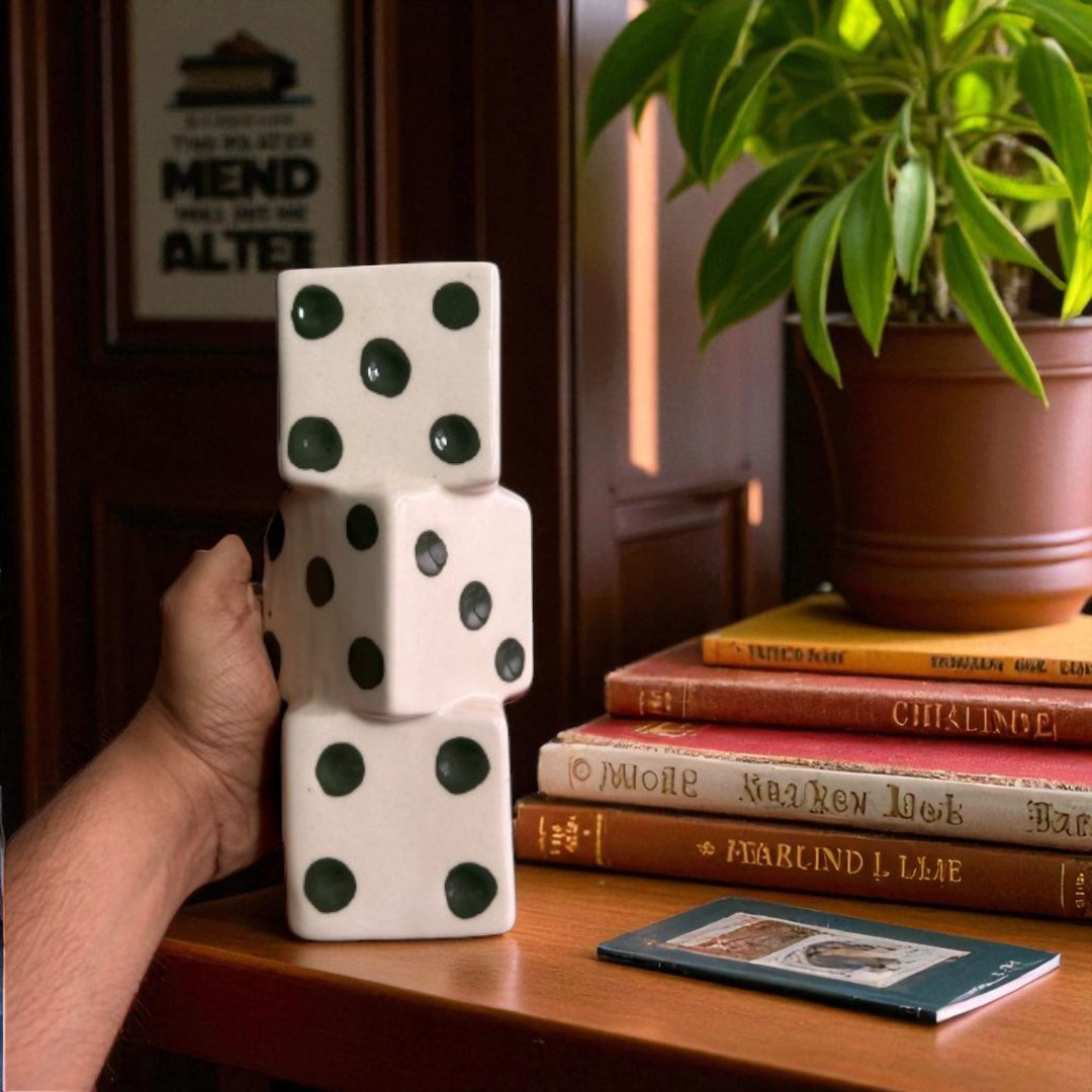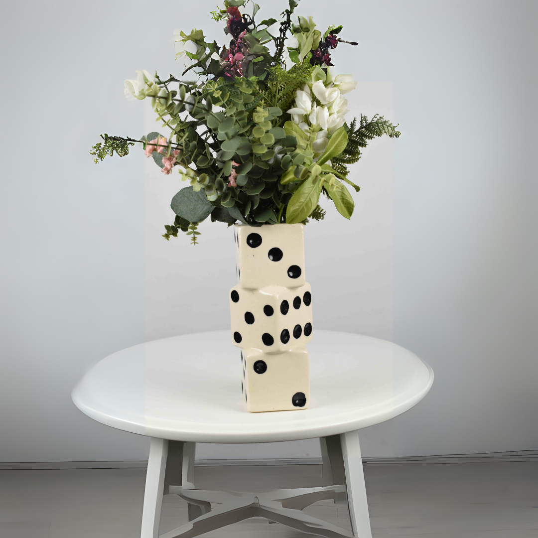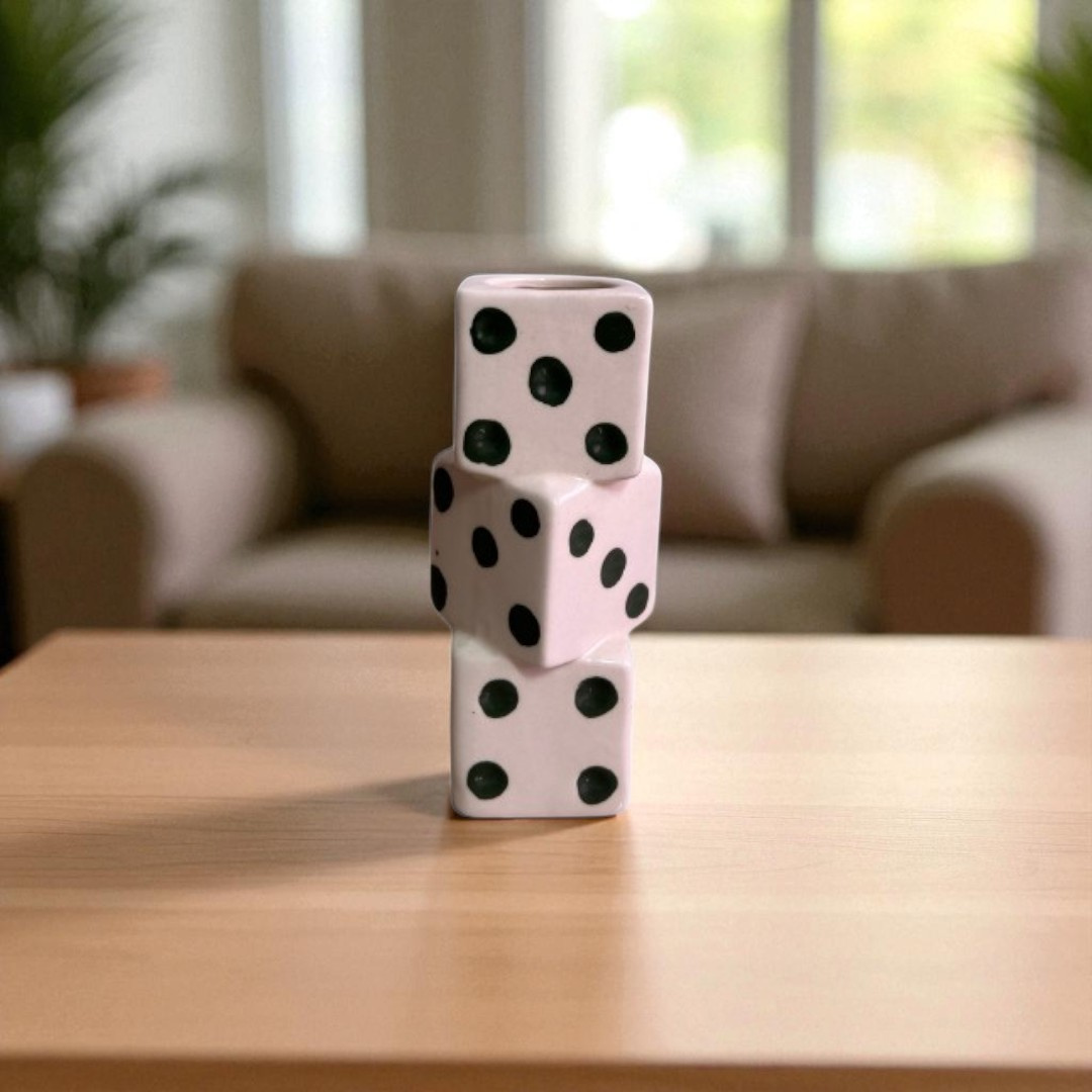 Add a playful twist to your décor with this eye-catching stacked dice ceramic vase. Designed to look like three classic dice stacked vertically, this unique piece is perfect for anyone who loves bold, conversation-starting accents. The glossy white finish and black dot detailing give it a clean and modern look while still being full of character.
