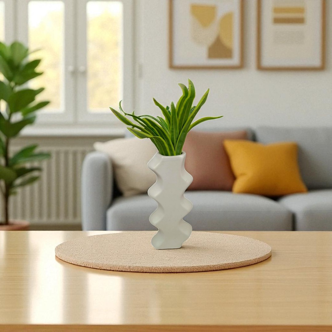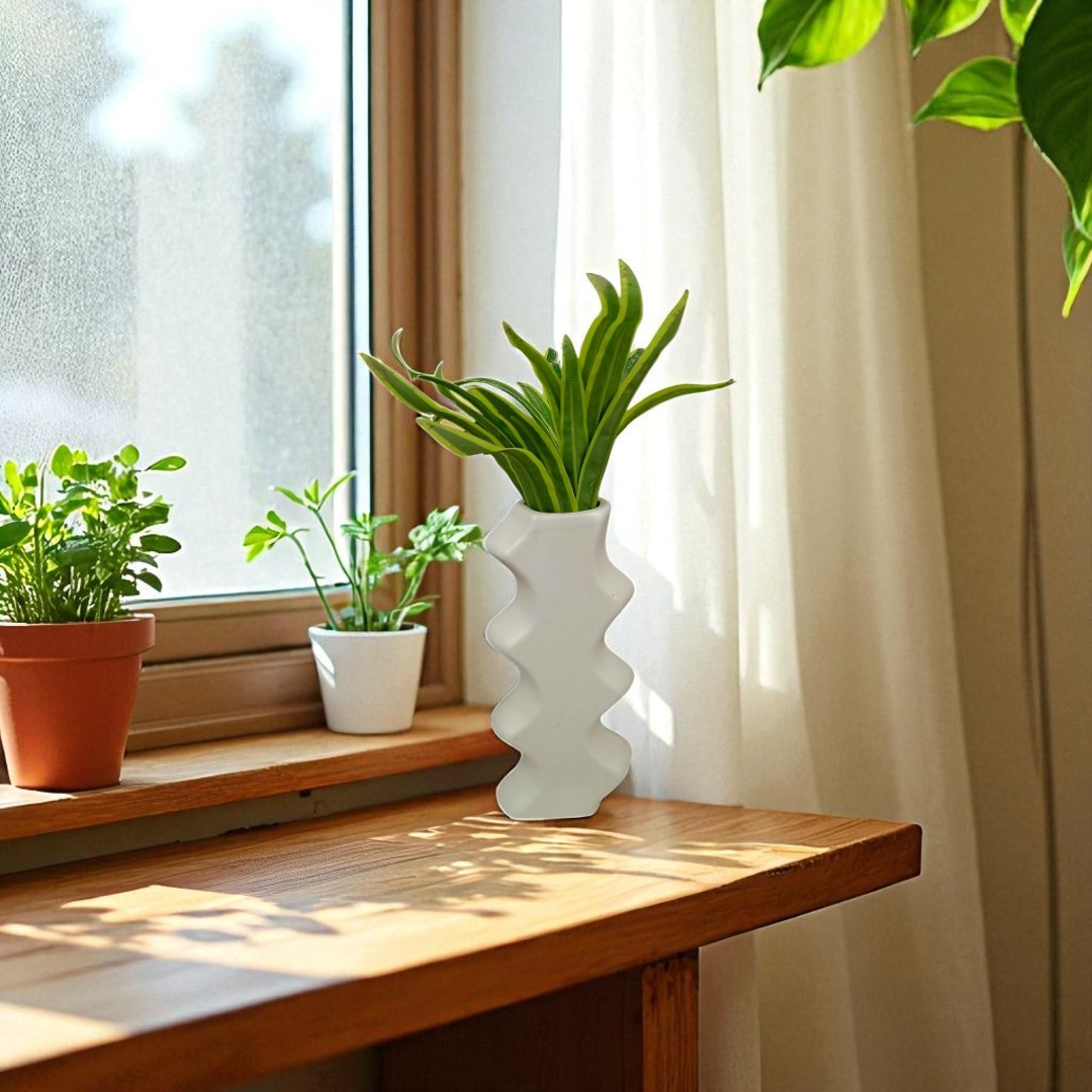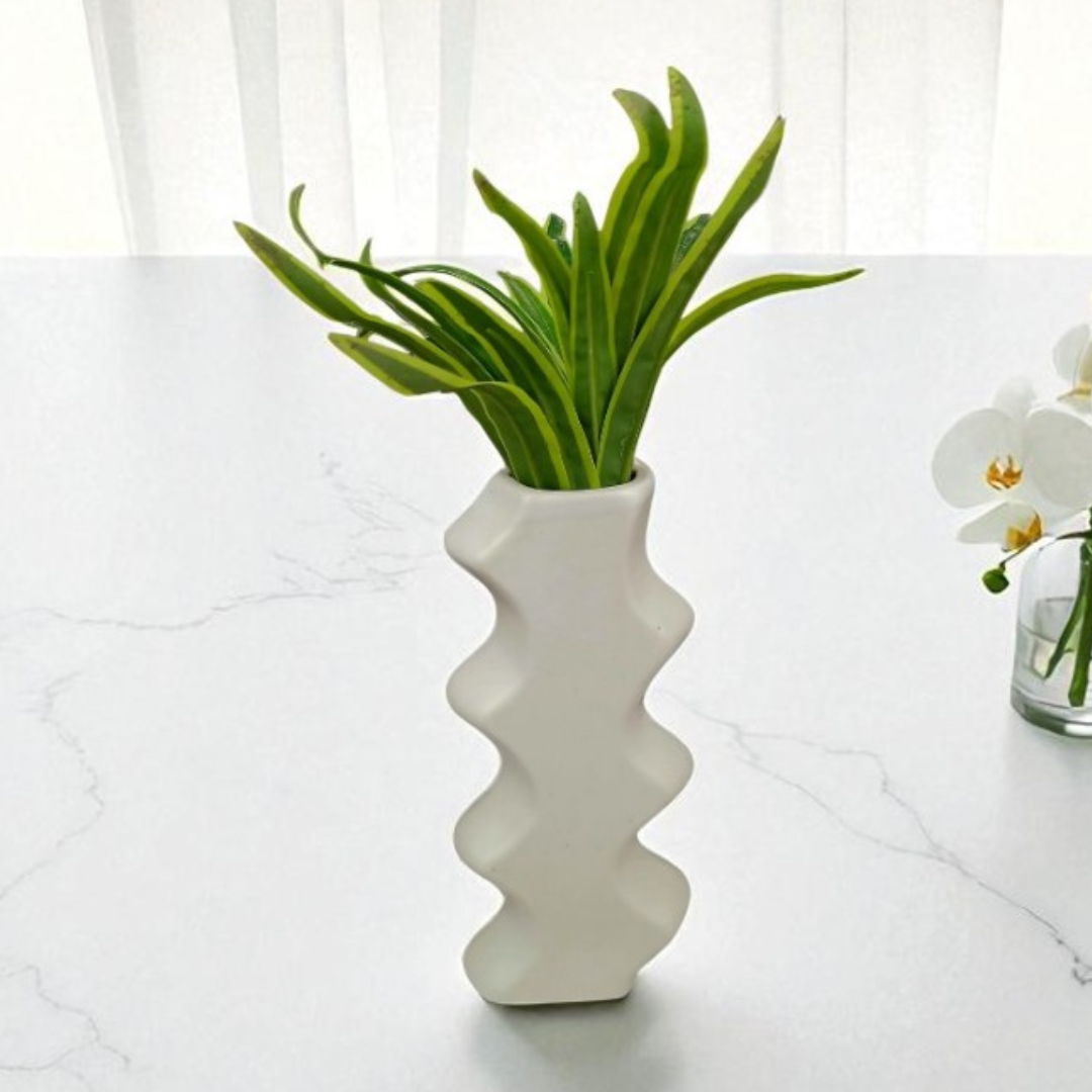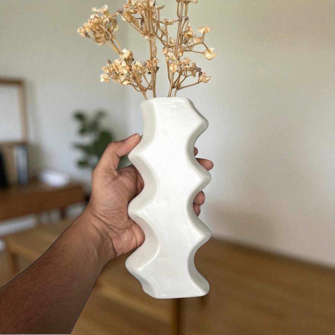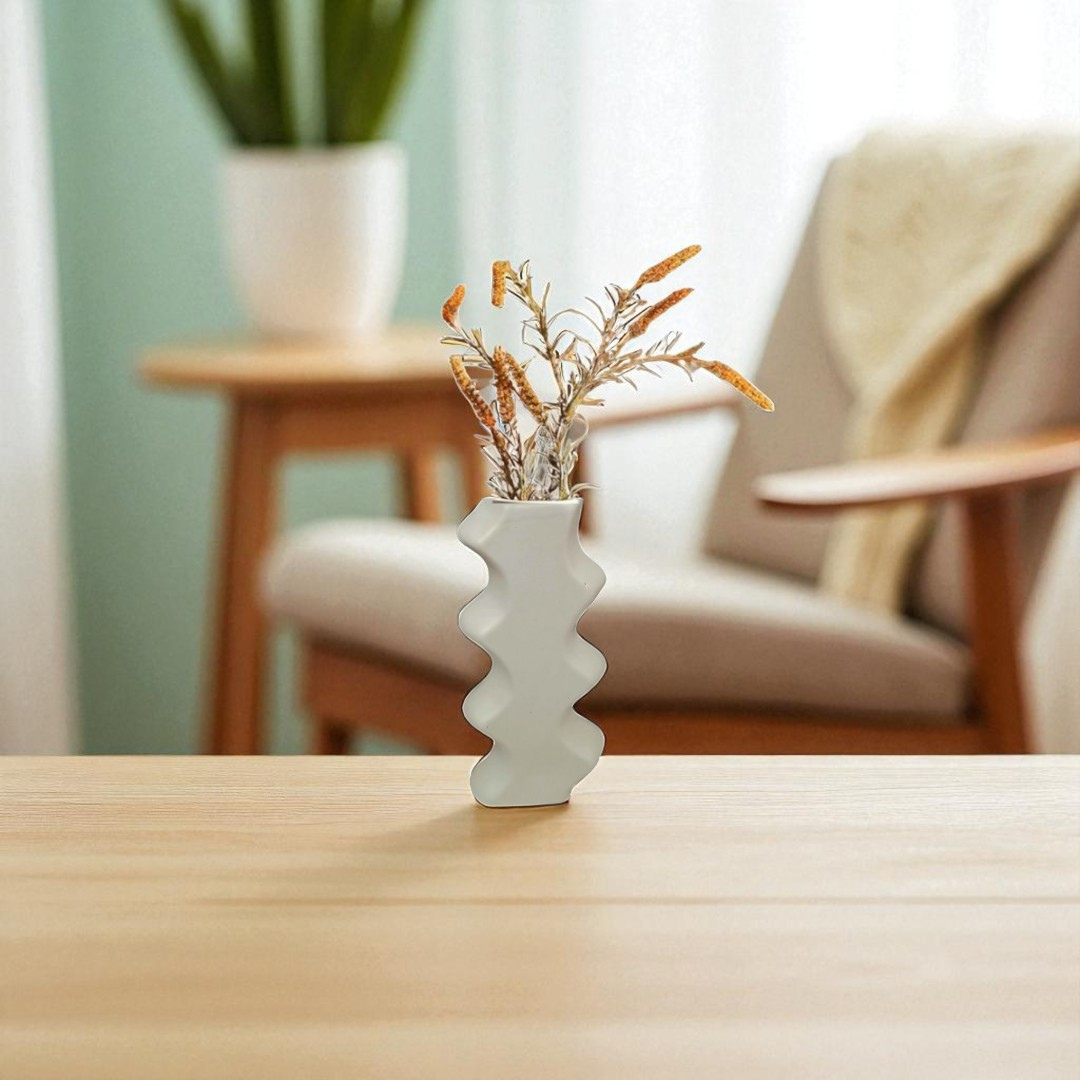 Add a touch of movement and artistry to your space with this white wavy ceramic vase. The sculptural form mimics soft ripples or undulating waves, making it a standout piece even when empty.