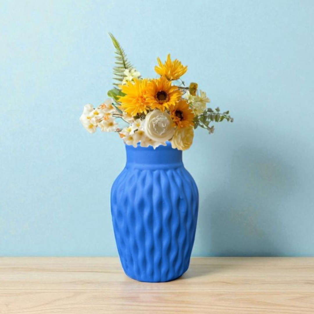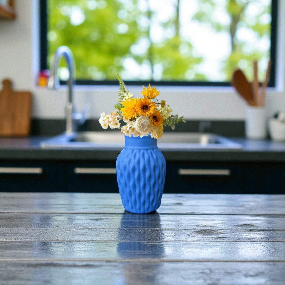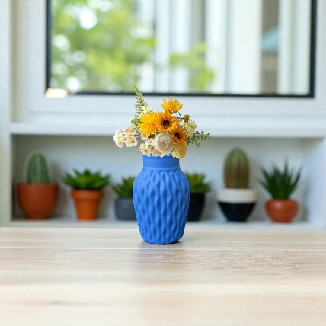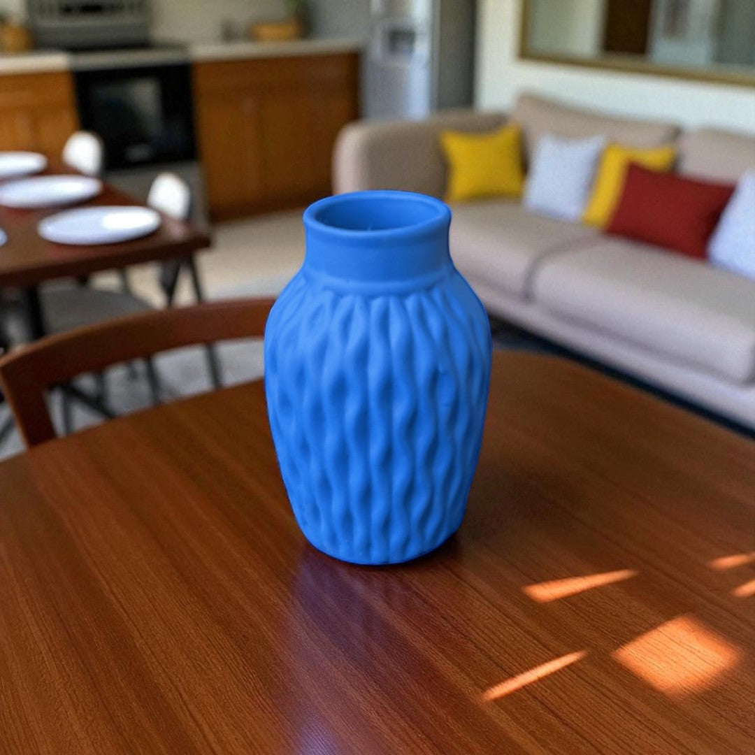 Bring timeless elegance to your home décor with this beautifully crafted matte blue ceramic vase. Featuring a unique wavy-textured design and a delicate satin ribbon accent, this vase adds charm and sophistication to any setting. Whether you're styling fresh flowers, dried stems, or simply displaying it as a decorative piece, it makes a graceful statement in any room.