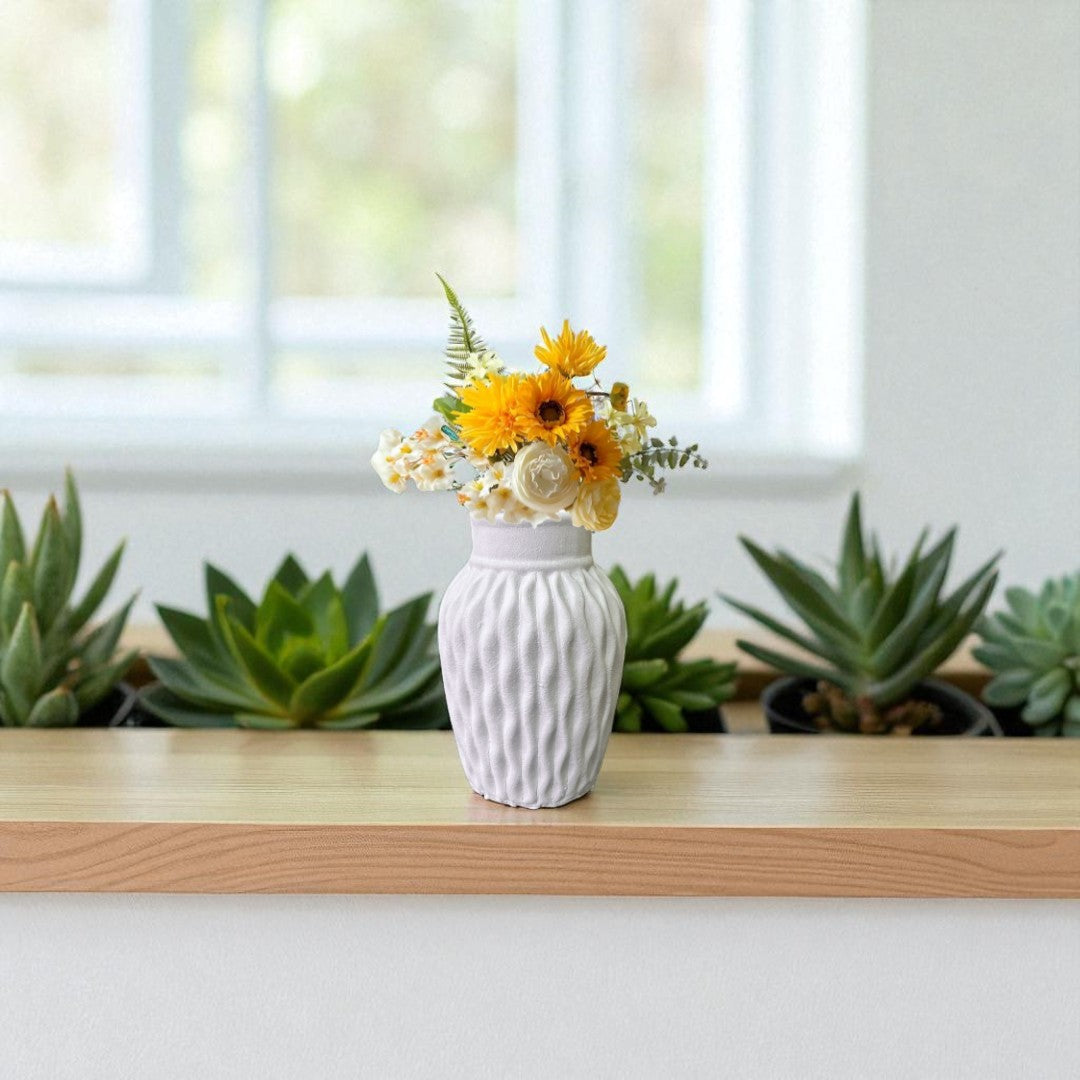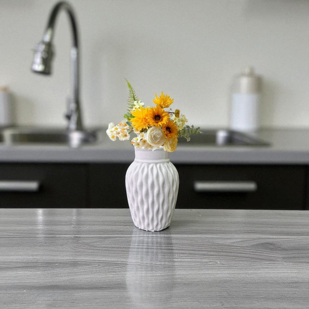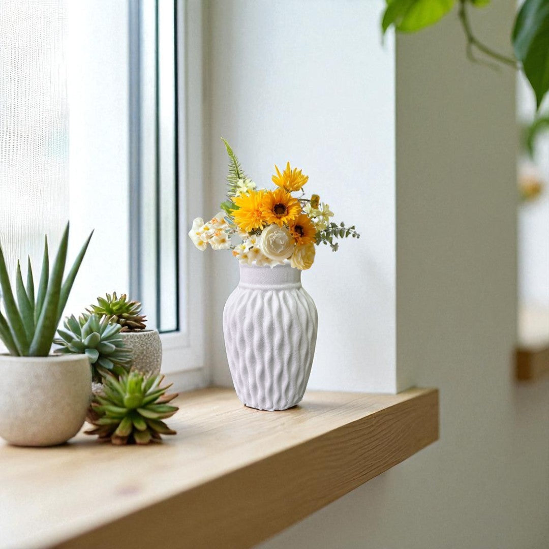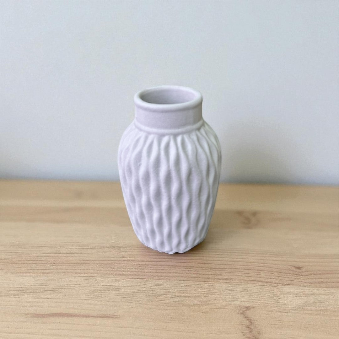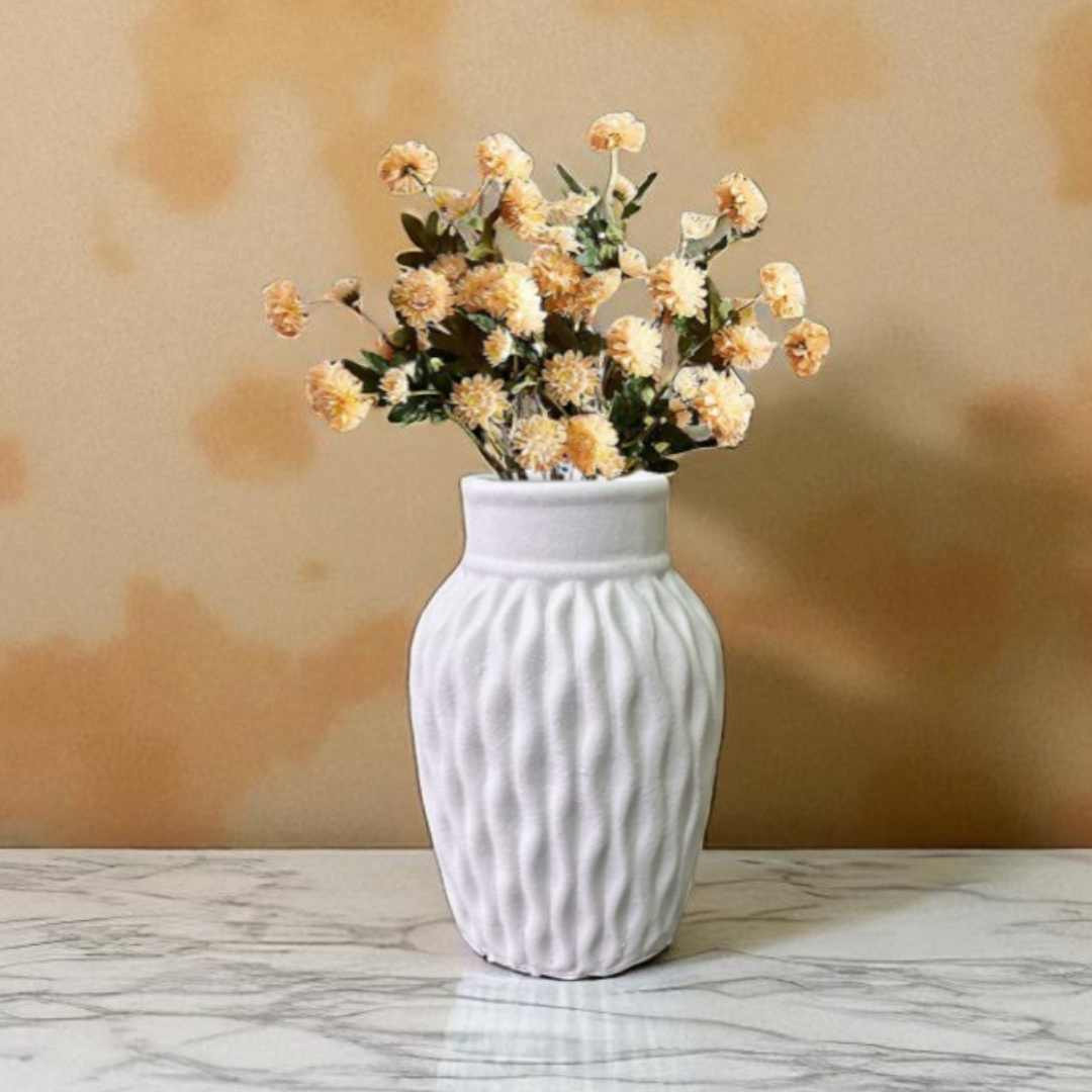 Bring timeless elegance to your home décor with this beautifully crafted matte gray ceramic vase. Featuring a unique wavy-textured design and a delicate satin ribbon accent, this vase adds charm and sophistication to any setting. Whether you're styling fresh flowers, dried stems, or simply displaying it as a decorative piece, it makes a graceful statement in any room.