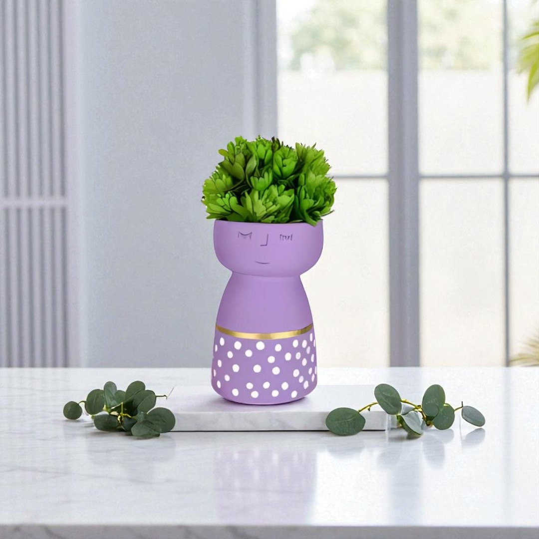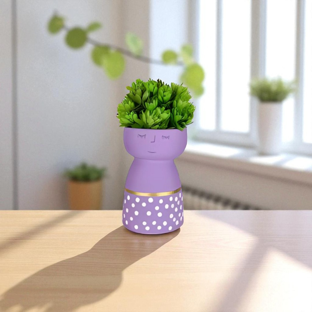 Whimsical Girl Face Vase – Purple Ceramic Planter with Polka Dots