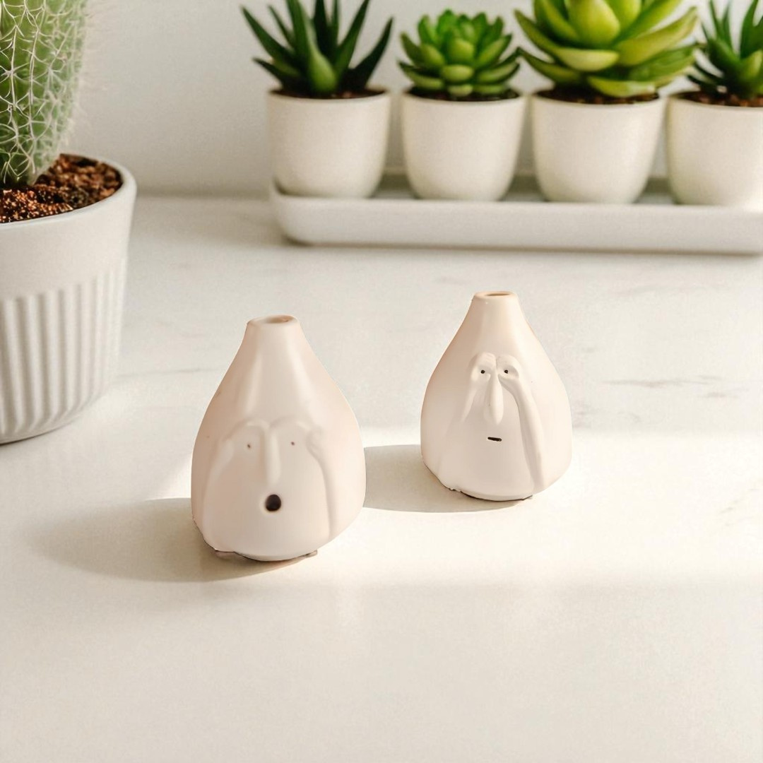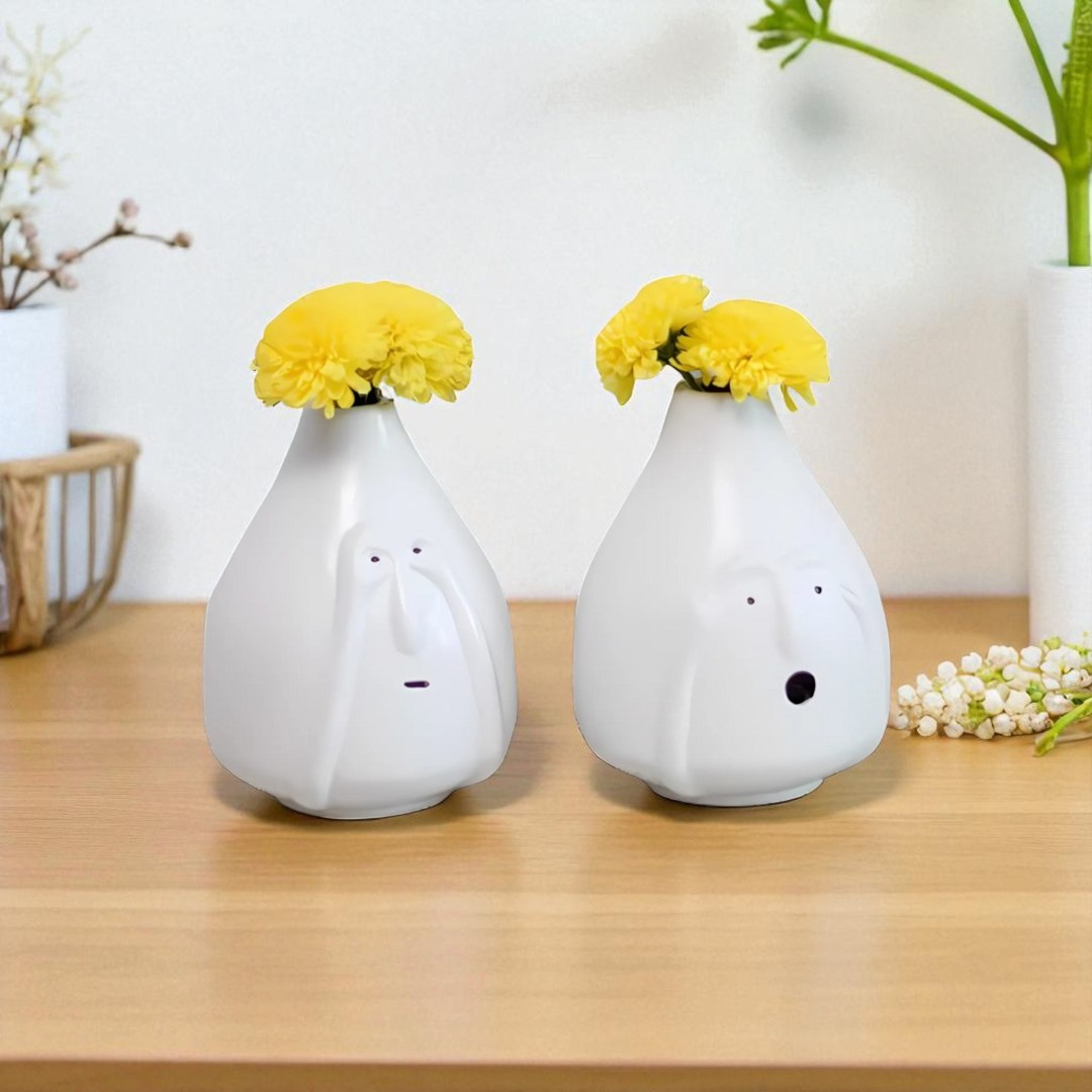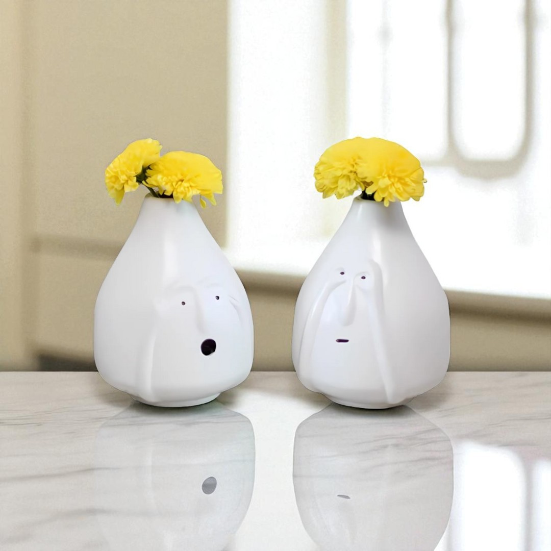 Add a touch of playful personality to your décor with this expressive ceramic vase duo. Featuring abstract facial designs—one wide-eyed and surprised, the other calm and contemplative—these vases are as much art pieces as they are functional vessels for your favorite flowers.